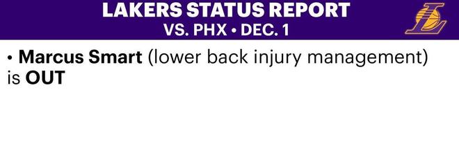 湖人队目前唯一的伤员是马库斯-斯马特,斯马特因下背部伤病管理缺席本场比赛,这也是他连续缺席的第三场比赛。