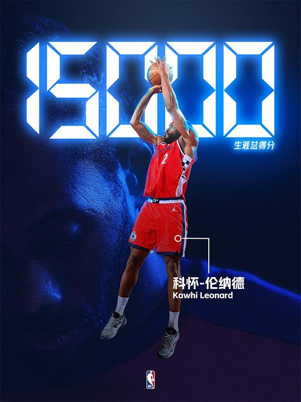 在第三节,伦纳德飙中一记三分,生涯总得分达成15000分里程碑。